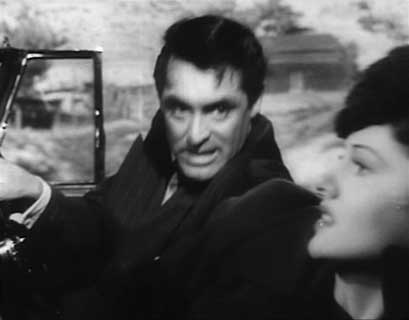 a coast road in a convertible driven by Grant, which he seems to shove someone out and from which someone who might be poisoned almost falls over a cliff into the sea; |